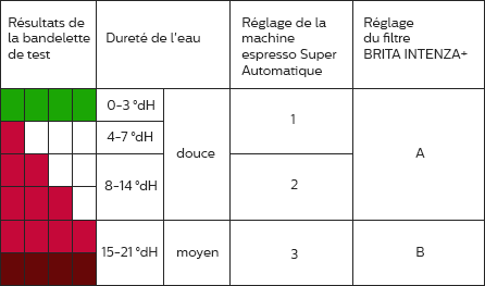 L'intervalle entre les détartrages de votre machine à café dépend principalement de 2 facteurs: 1. Le niveau de sels de calcium et de magnésium dissous dans l'eau de votre région (mesuré dans la « dureté de l'eau ») 2. La quantité d'eau qui passe dans votre machine à café ou espresso. La plupart de nos machines à café et espresso modernes comportent un indicateur signalant qu'un détartrage est nécessaire. Pour les machines espresso Super Automatique, il sera nécessaire d'indiquer la dureté de l'eau dans la machine, afin qu'elle vous invite de manière adéquate à détartrer. Si votre machine ne dispose pas d'un tel indicateur, reportez-vous au tableau ci-dessous pour connaître la fréquence de détartrage. Comme vous pouvez le voir, l'utilisation d'un filtre à eau BRITA INTENZA+ doublera la durée entre deux détartrages.