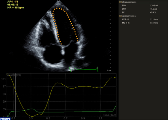 Découvrez HeartModelᴬ⋅ᴵ⋅, une nouvelle application d’intelligence anatomique appliquée à l’échographie (AIUS) intégrant les fonctionnalités suivantes pour l’échocardiographie : quantification 3D temps réel, affichages 2D automatisés et reproductibilité performante. HeartModelᴬ⋅ᴵ⋅ détecte, segmente et quantifie automatiquement l’oreillette gauche et le ventricule gauche à partir d’un volume 3D.